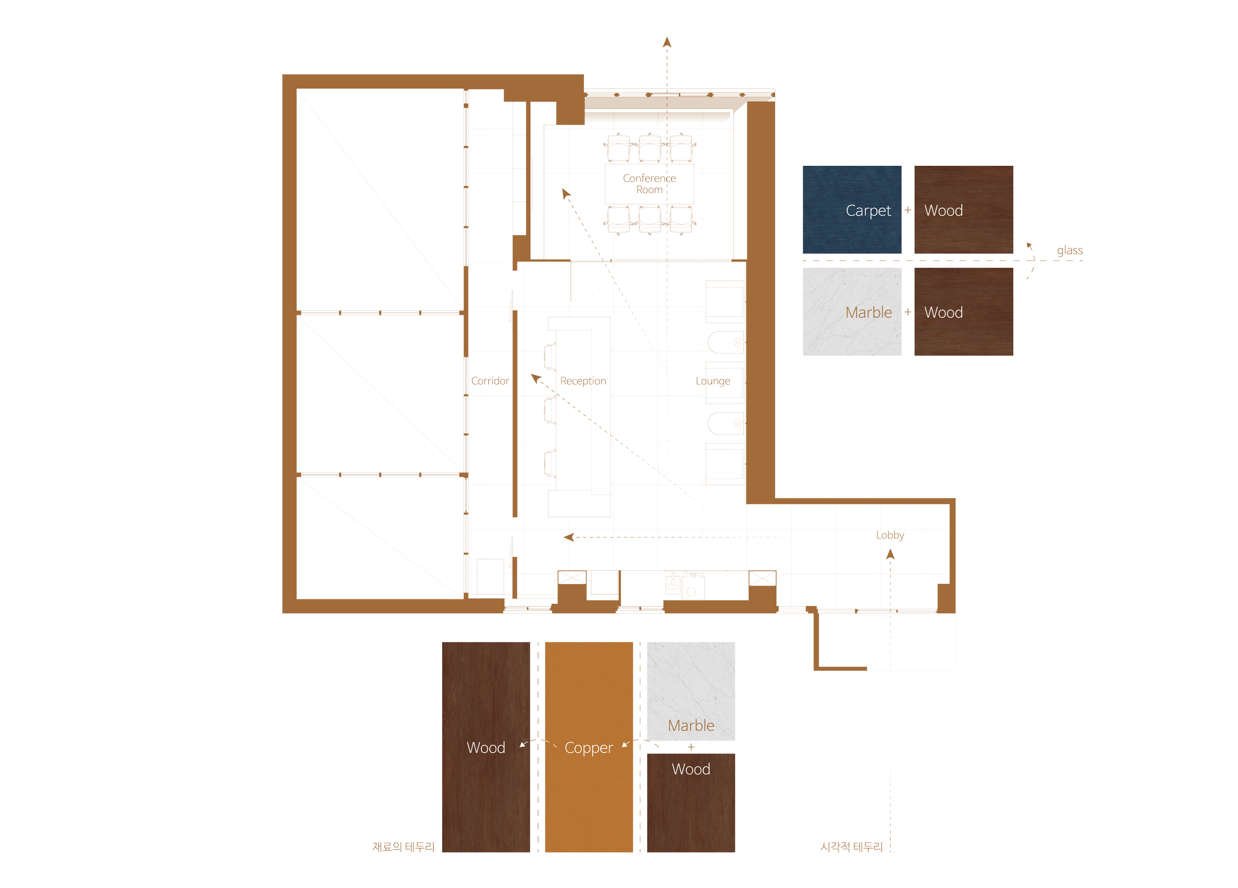 바닥과 일부 벽면의 대리석 무늬, 벽면의 나뭇결, 가구에 적용된 코퍼, 일부 바닥의 카펫. 공간에 쓰인 재료들은 프로그램의 경계와 기능의 경계, 사람이 움직이는 영역과 그렇지 않은 영역의 경계를 각각 형성하고, 그 경계들을 순차적으로 넘어서며 공간이 완성됩니다. 이것은 공간의 미시적인 넘어섬입니다. 공간의 무형적 개념과 가시적 실체를 바탕으로 한 여러 겹의 전이의 과정은 결국 하나의 컨셉으로 귀결됩니다.