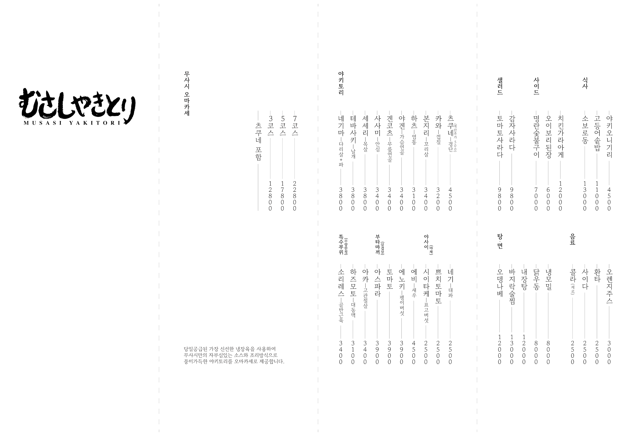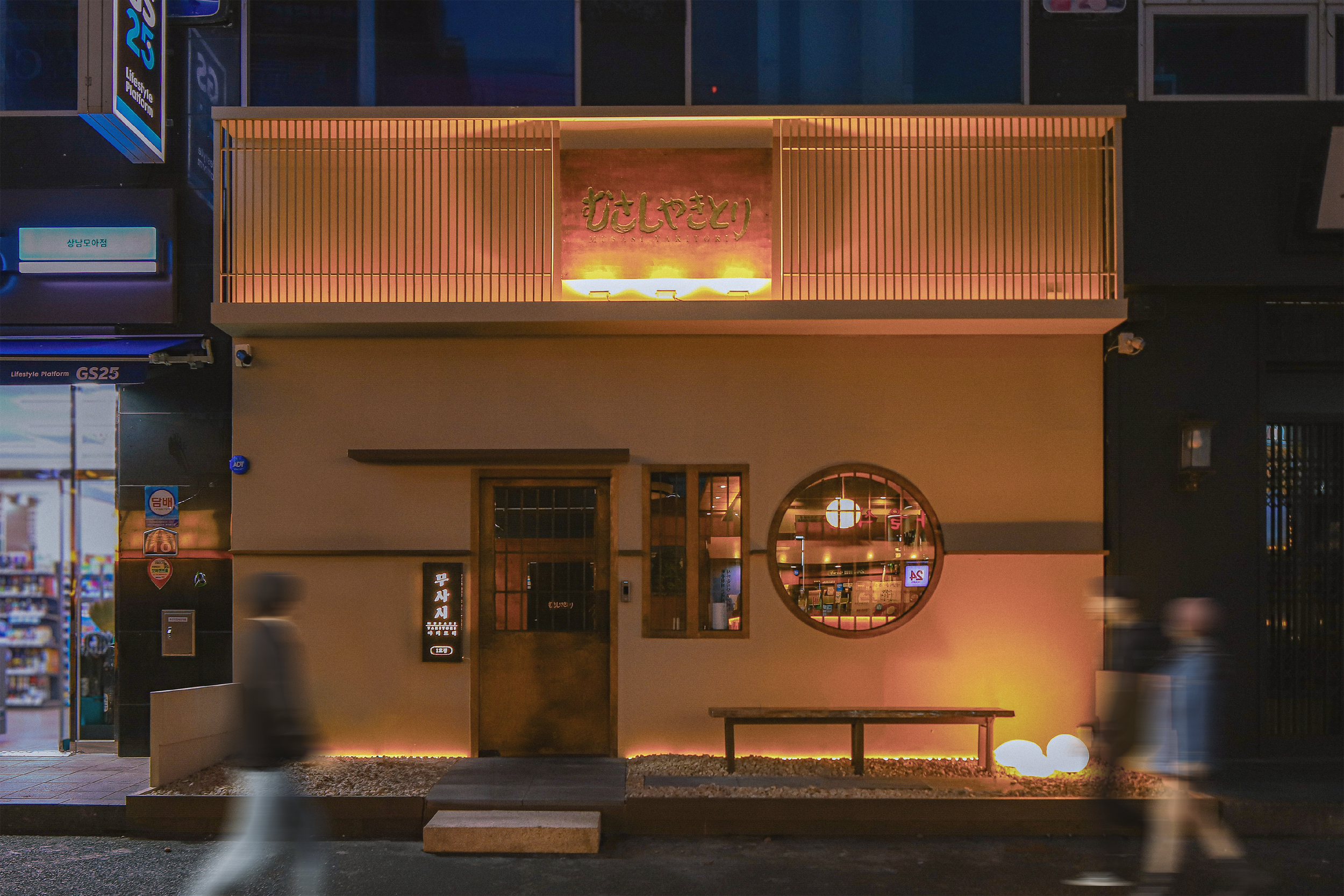 야키토리 무사시는 창원 상남동의 번화가에 위치한 레스토랑입니다. 많은 음식점 사이 이목을 끌 수 있는 외부 입면을 포함하여 내부 공간 디자인과 그래픽 작업을 담당하였습니다.