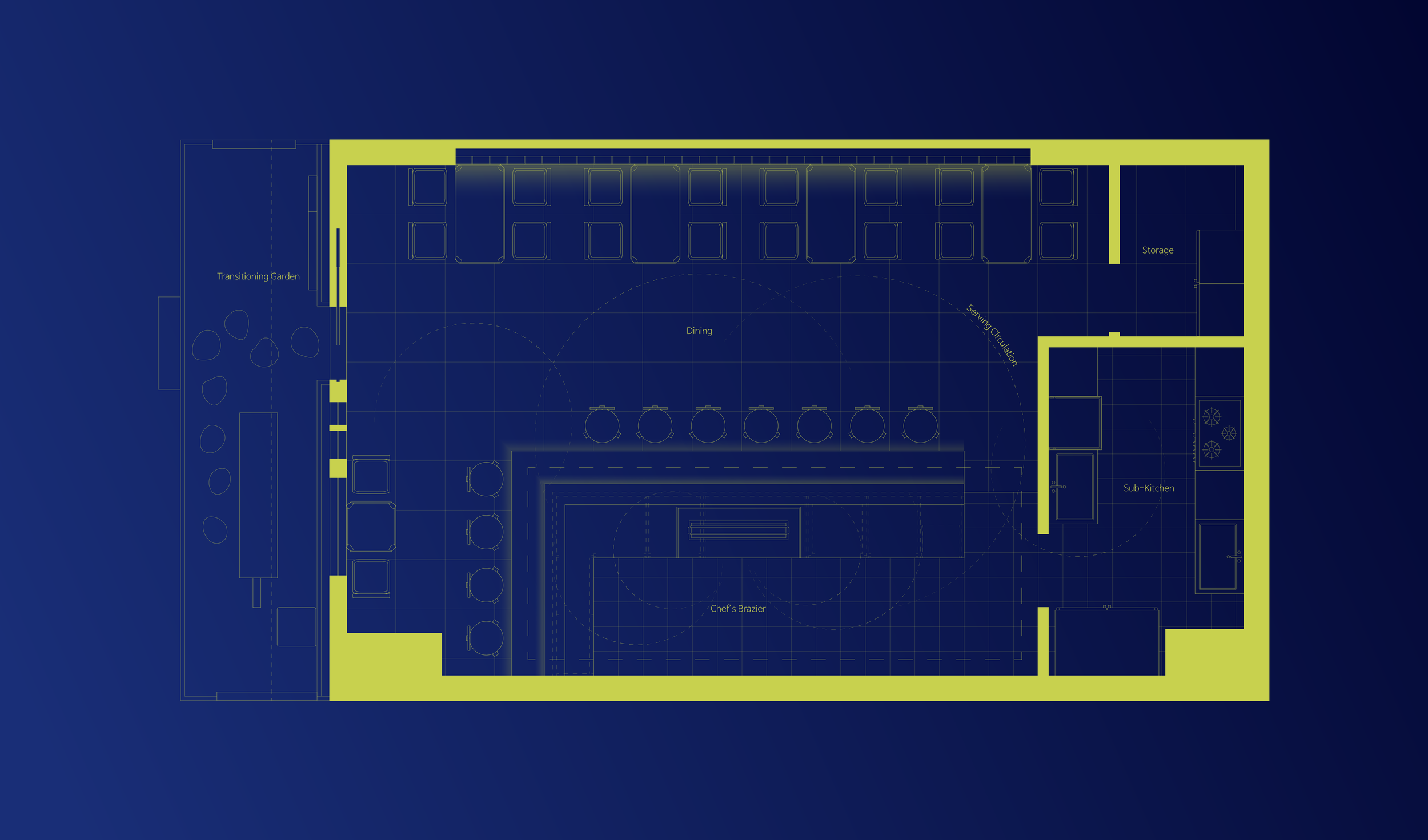 복잡한 번화가에서 시선을 집중시킬 수 있도록 외부 입면에는 에너지를 뿜어내는 볼드한 디자인 언어를 적용했습니다. 반복되는 수직과 수평의 패턴은 내부로 연장되며 사람들의 시선과 발걸음을 자연스레 유도합니다. 적당히 제한된 창은 내부와 외부가 서로 프레이밍 되며 감상할 수 있는 여지를 만들고, 거리와 레스토랑의 경계를 형성하는 작은 정원은 짧지만 강렬한 전이 공간의 역할을 수행합니다.