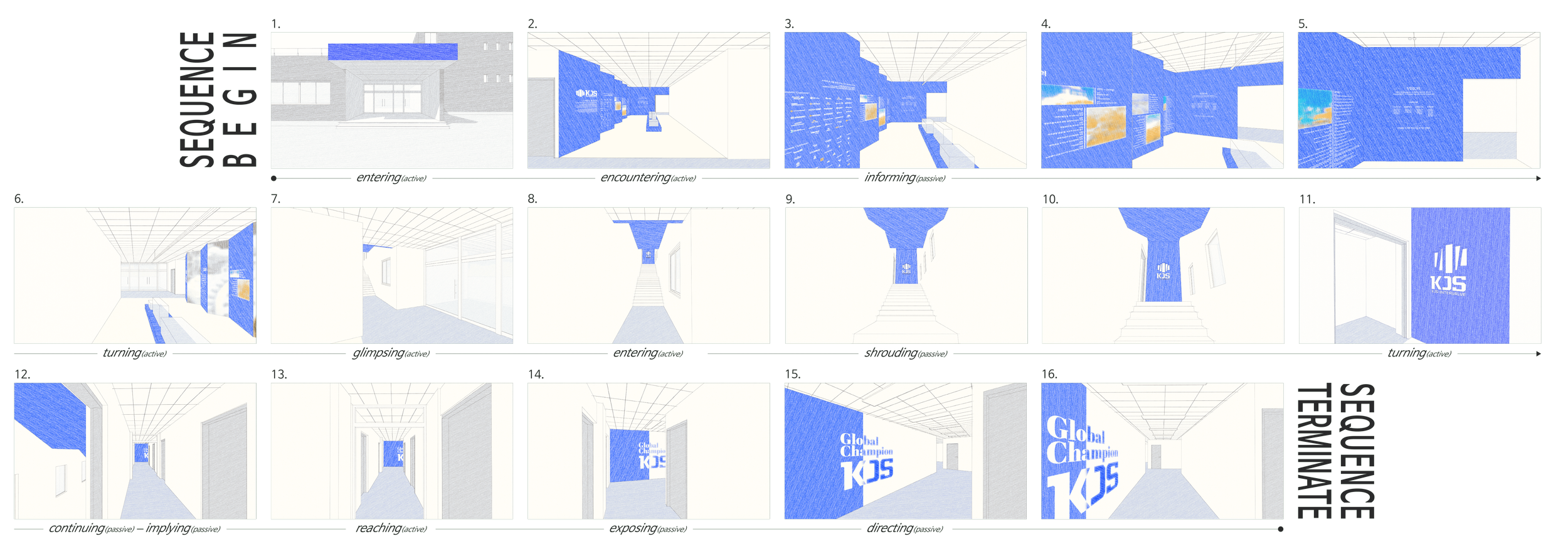 1층 디스플레이 공간에서부터 2층 사무공간에 이르기까지 공간적 연결선으로써 색을 사용한 시각적 시퀀스를 도입하였습니다. 이러한 디자인적 개입은 단순한 미학적 요소를 넘어, 평범한 동선을 브랜드의 서사가 담긴 공간으로 전환하여 방문객에게 기업의 이미지를 각인시키는 역할을 합니다. 방문객의 동선(혹은 여정)은 능동적 참여와 수동적 참여로 구분되어 작용하는 이동 시퀀스로 구성됩니다. 맞닥뜨리고, 정보를 전달받고, 감싸지며 연결되는 등의 전이적 행동은 기업의 핵심 공간으로 향하는 과정이 브랜드의 정체성을 강화하는 몰입적 경험이 될 수 있도록 작용합니다.