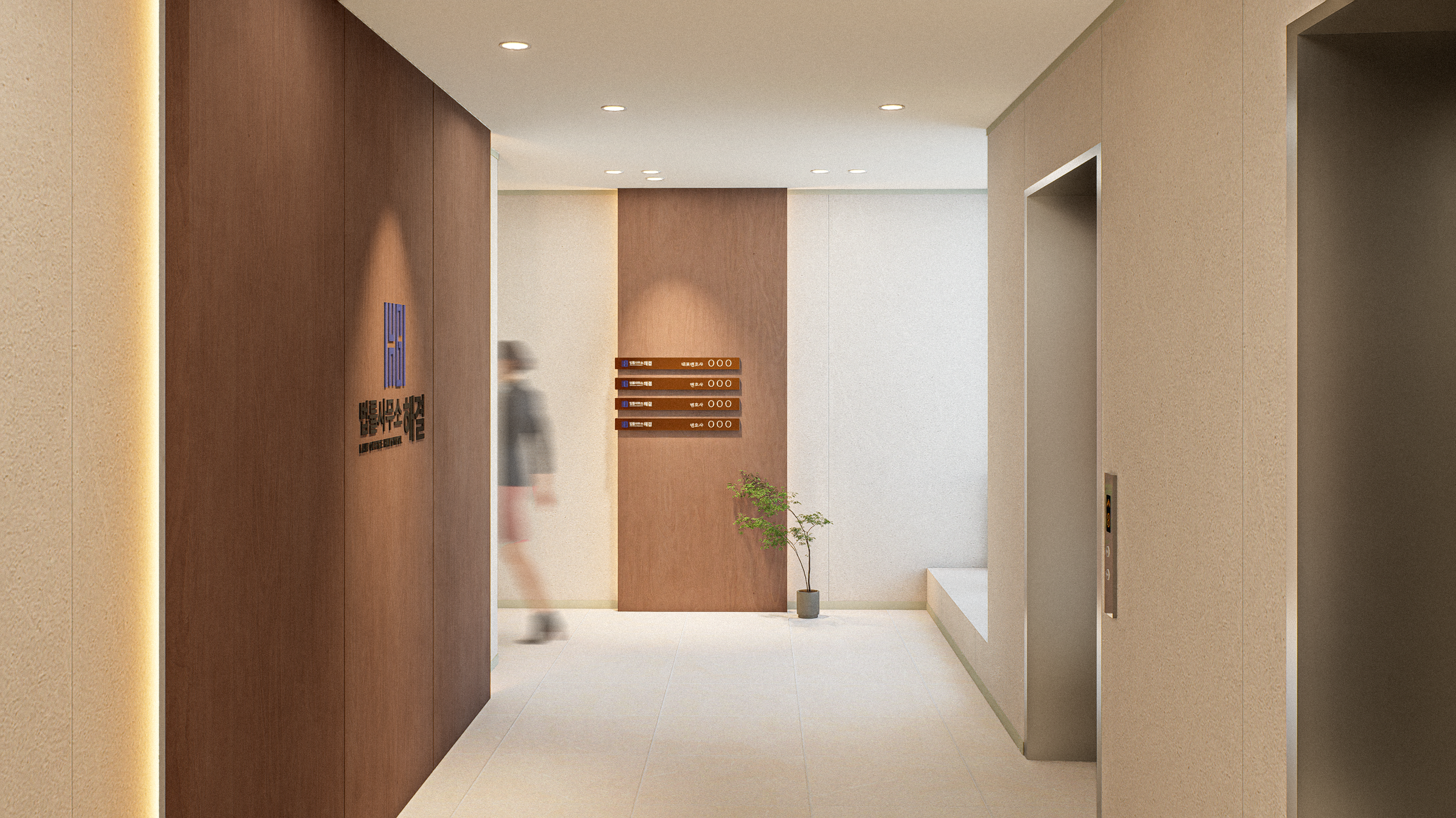 공간 레이아웃의 핵심은 중앙에 위치한 거대한 나무 기둥입니다. 이는 흔들리지 않는 굳은 신뢰를 표상하며, 로비 공간과 사무 공간을 자연스럽게 분리하는 경계가 됩니다. 이 중심축을 바탕으로 나뭇가지가 뻗어나가듯 각각의 프로그램이 연결됩니다. 기둥이 숲의 몸통으로써 시각적 신뢰감을 제공한다면, 개별 방들은 변호사와 고객을 위한 심리적 그늘이 되는 아늑한 상담환경을 조성합니다.
