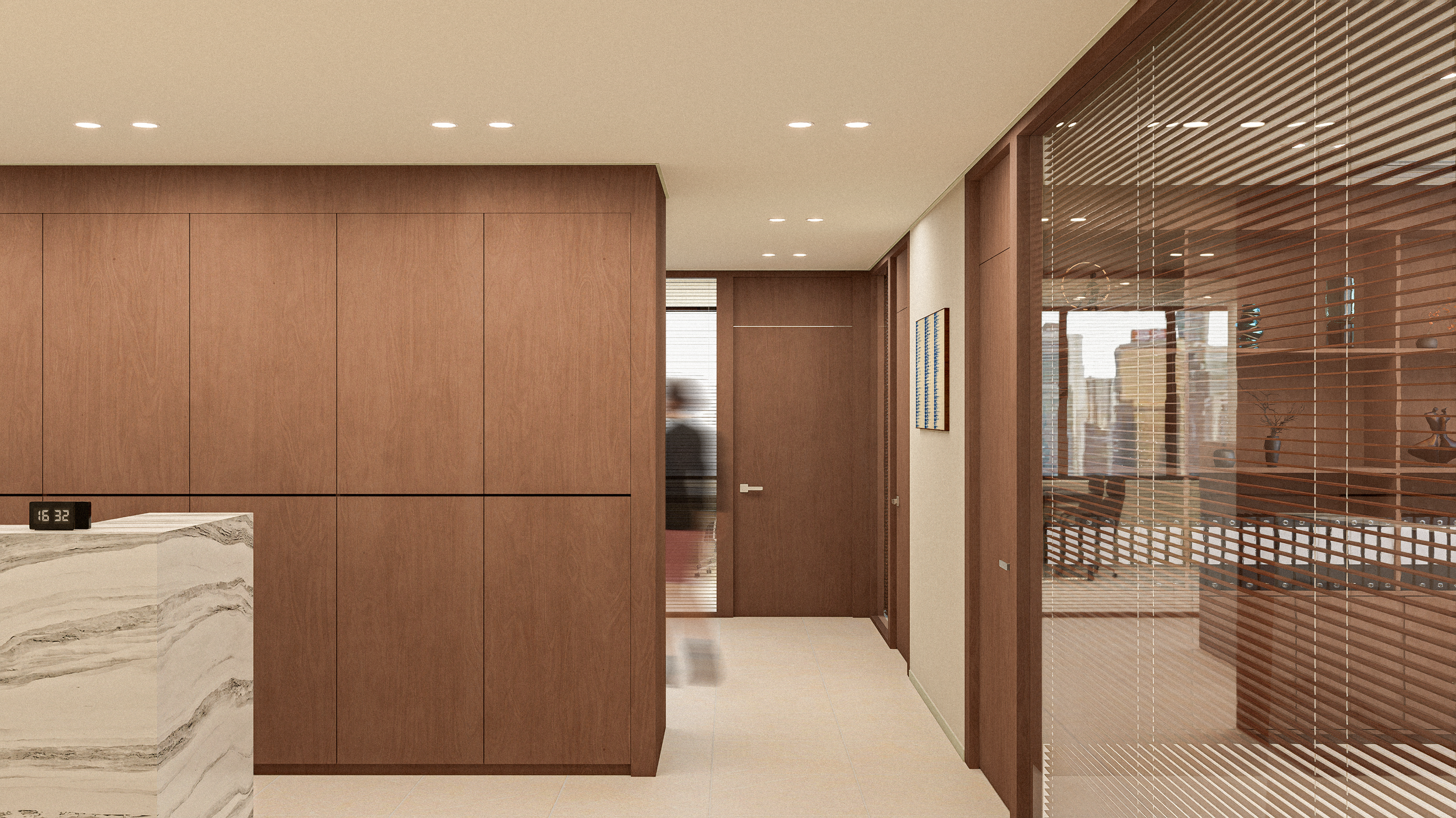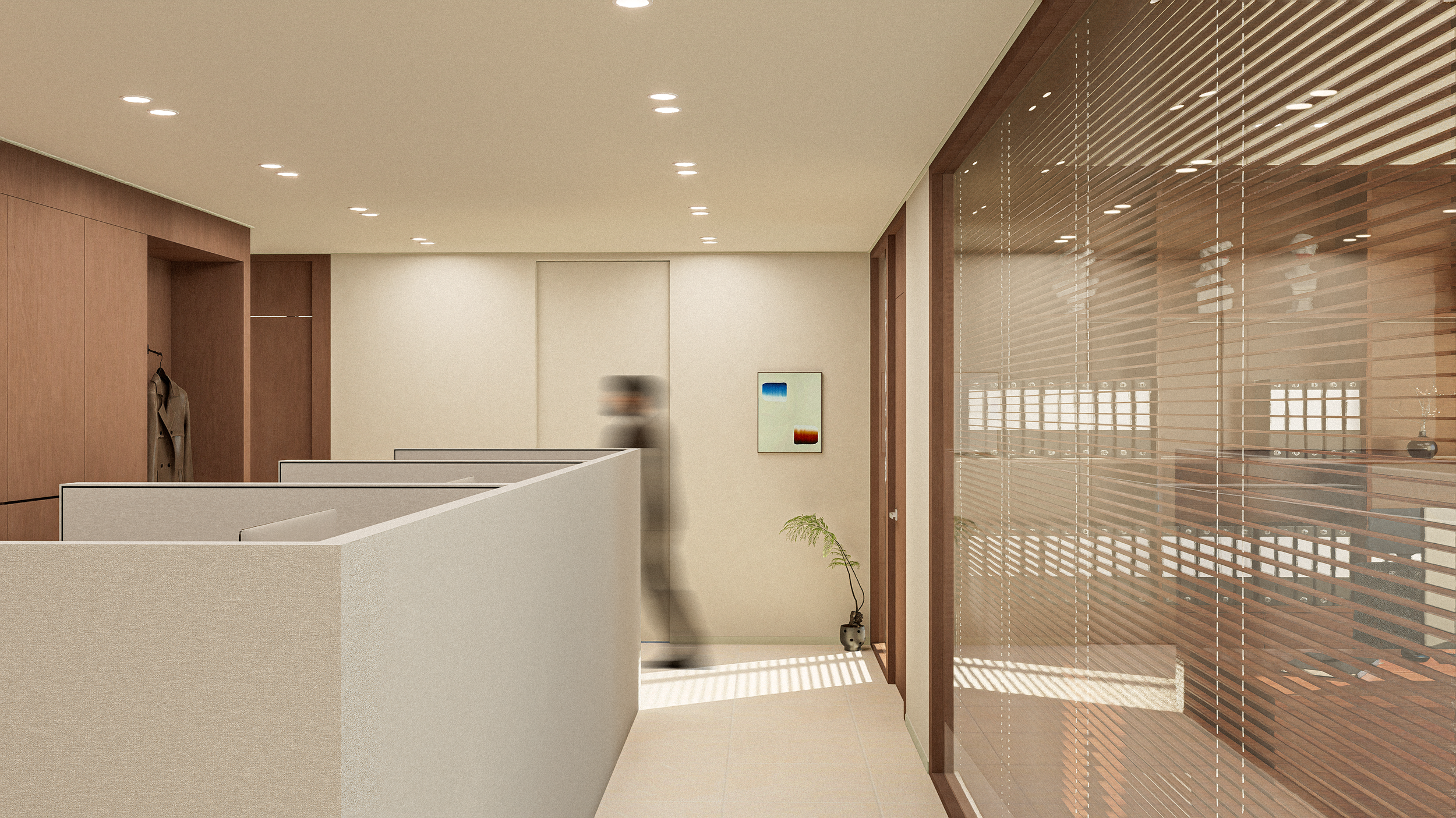 As one walks along the path following the wooden pillar, the landscape gradually unfolds. Natural light, entering through large windows framed in each room, permeates deep into the space like sunlight filtering through forest branches. This interplay of light, warm wood tones, and refined finishes harmonizes to maintain a sense of legal precision while creating a space where calm efficiency and the forest's vitality coexist.