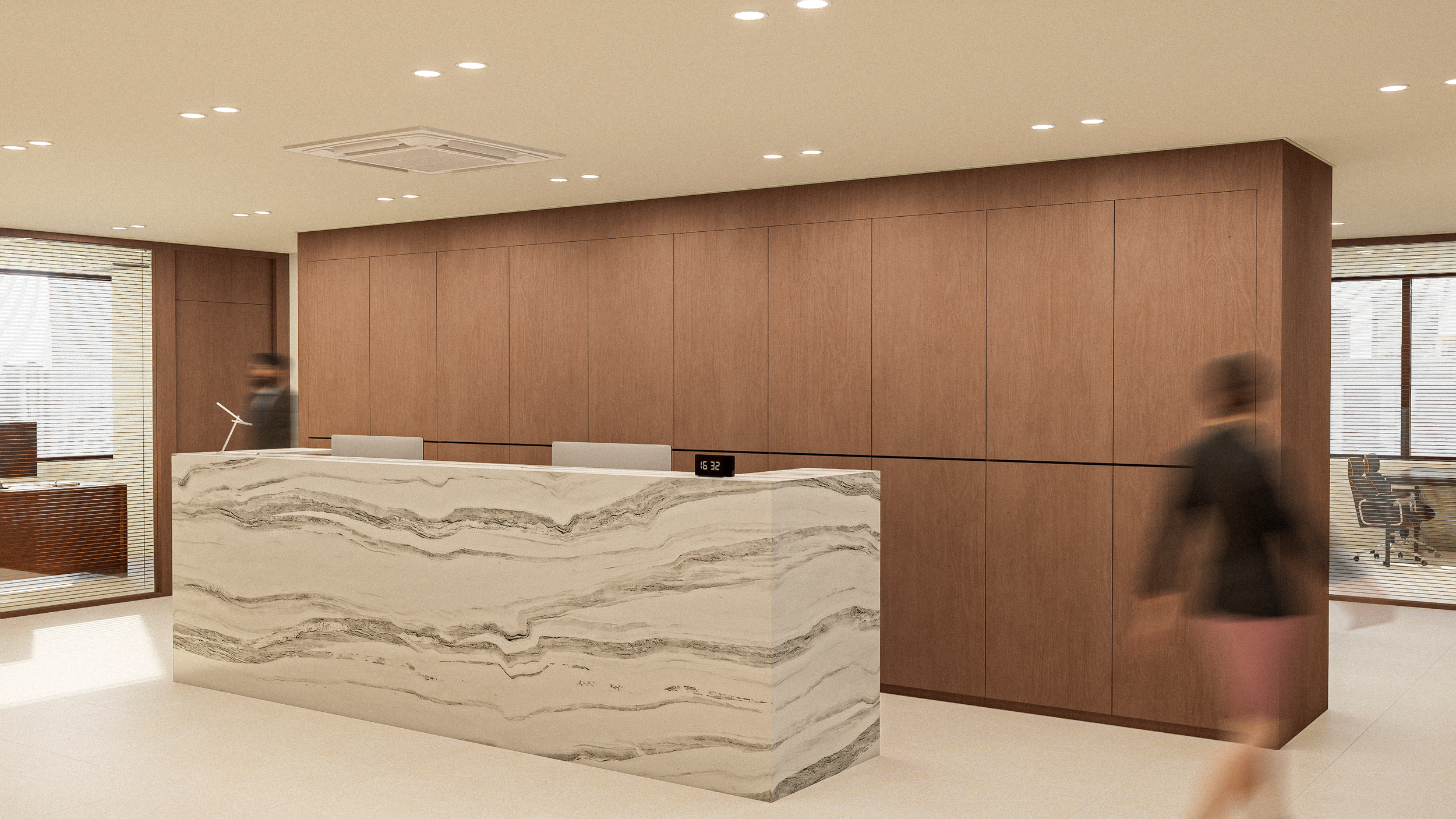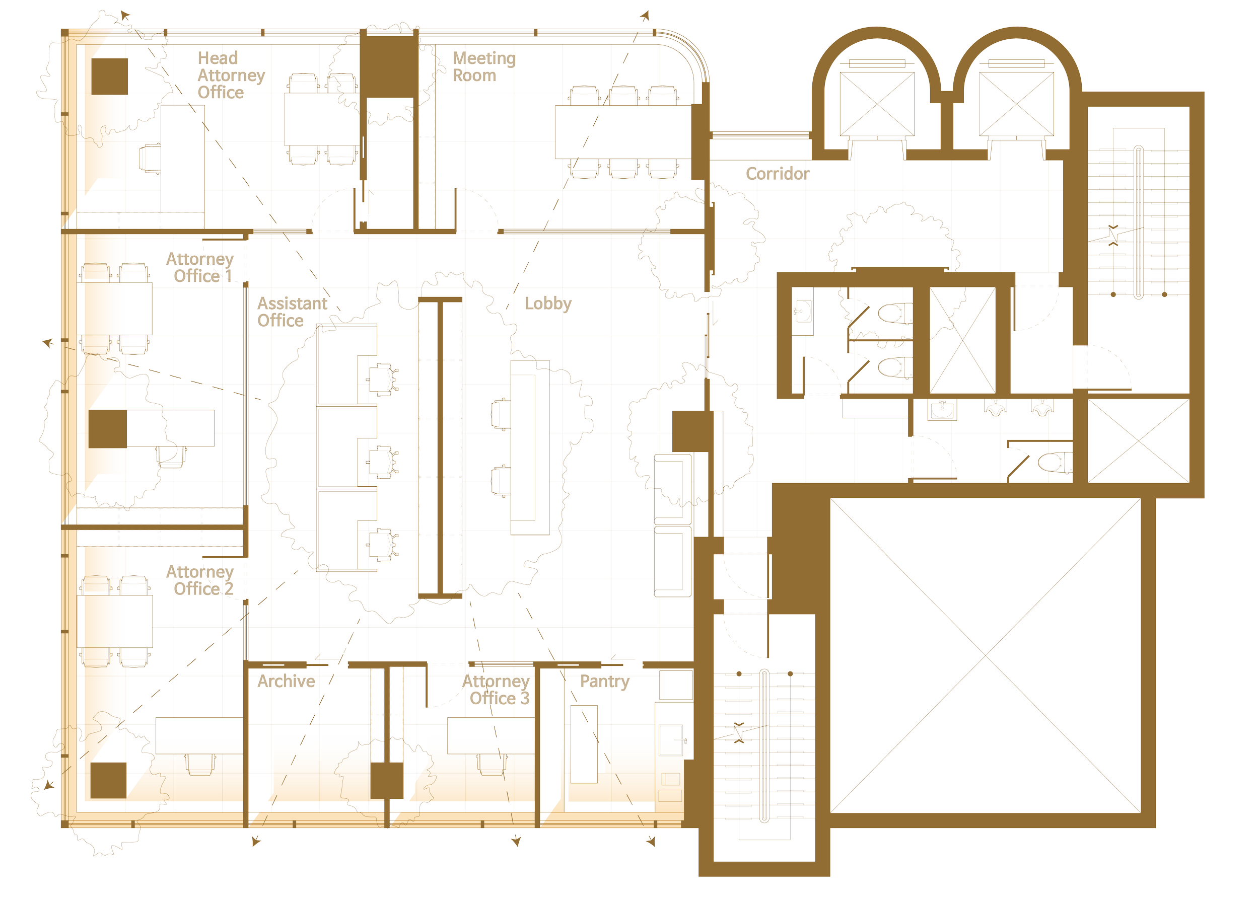 큰 제재소를 운영하는 가문의 클라이언트는 오랜 기간 나무를 친밀히 생각하였고, 자신의 첫 사무실 또한 마땅히 숲의 형상이 되어야 했습니다. 우리는 숲이 지닌 평온함과 포용력, 법률 전문가에게 요구되는 엄격한 신뢰성과 전문성이라는 상반된 모티브를 조화롭게 풀어나가는 데 집중했습니다. 이러한 결합을 통하여 공간은 단지 경직된 분위기를 연출하는 법률사무소가 아닌, 고객이 법적인 보호를 받는 동시에 정서적인 안락함을 느낄 수 있는 산림이 되어줍니다.