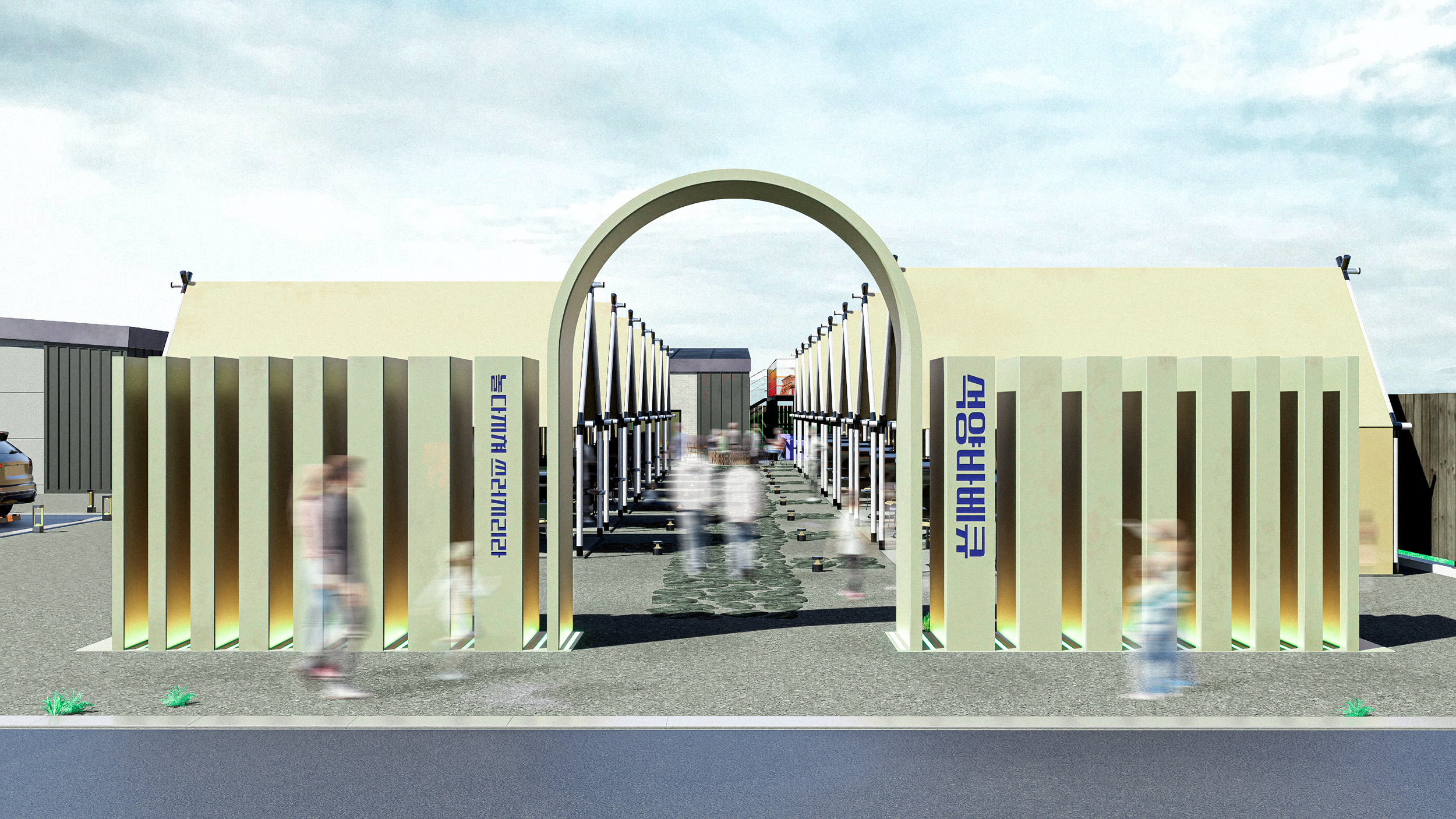 캠핑장 입구에 이르면 거대한 아치형 조형물이 방문객을 맞이합니다. 이는 미지의 공간으로 진입하는 경험적 장치로, 아치 기둥들 사이의 틈은 내부의 이미지를 부분적으로 노출하며 너머의 공간에 대한 호기심을 유도합니다. 하단에서 은은하게 뿜어져 나오는 조명은 석양의 빛을 닮아 구조물에 생명력을 불어넣습니다.